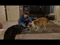 Tässäpä poikien tapaaminen ja Titon patsastelua. Tito on kellistetty kyljelleen videolla sen vuoksi, että yksi tyttöpentunen säikähti sitä järjettömän paljon. Tito oli kyljellään maaten vähemmän uhkaava, joten se sai tyytyä tähän järjestelyyn. Näkee, että Tito voisi mieluummin olla jossakin muualla, mutta vaihtoehtoja ei nyt annettu. Hyvin se tuntui kestävän pentujen lääppimisen.